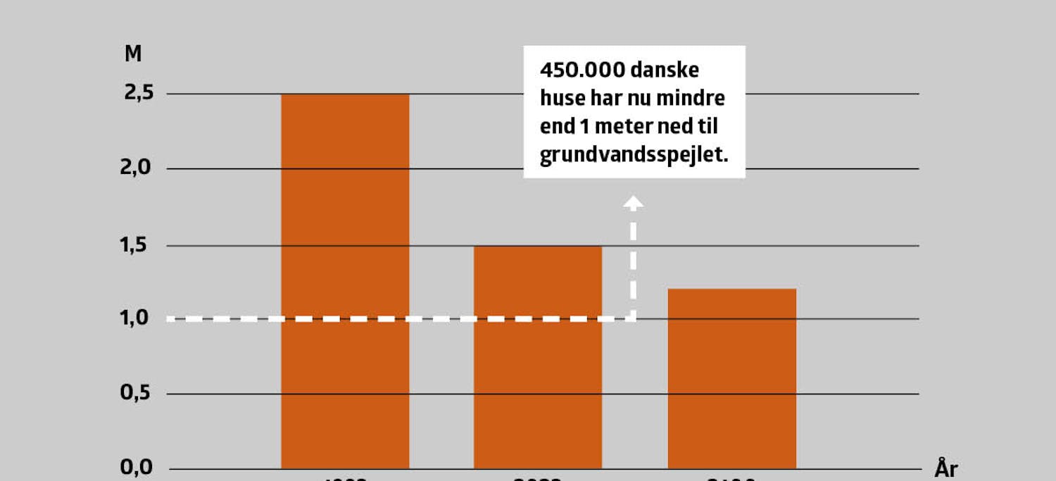 Grundvandsspejlet er steget 1 meter de seneste 30 år og ligger nu blot 1,5 meter under overfladen i gennemsnit.