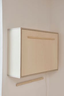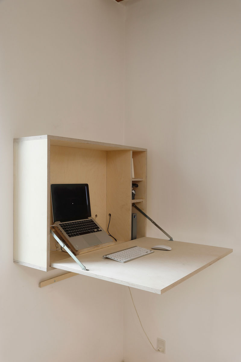 For at kunne justere skrivebordets højde, så du kan vælge mellem at stå og sidde under arbejdet, sætter vi tre skrå lister (L) bag på møblet. På væggen sætter vi også tre lister. Så kan møblet sættes enten oppe eller nede, afhængigt af om du vil stå eller sidde.