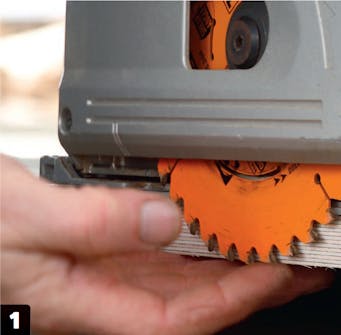 Dyksaven indstilles til at save ca. 1-2 mm dybere end pladetykkelsen - derved flosser snittet mindst muligt (saven var slukket under denne demonstration).