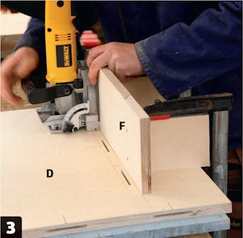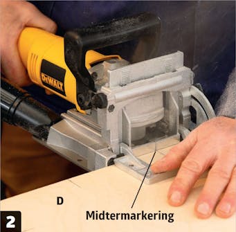 Fræs ud til dyvler i bagbeklædningen (D). Midtermarkeringen på maskinen placeres præcis ud for opstregningen som vist. Maskinen startes og skubbes ind mod pladekanten.