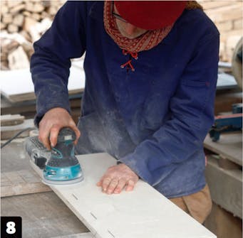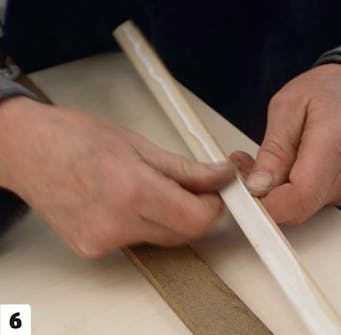 Vi skærer listerne ud af finerpladen med 45-graderssnit. Hver anden gang vinkles saven til den modsatte side.