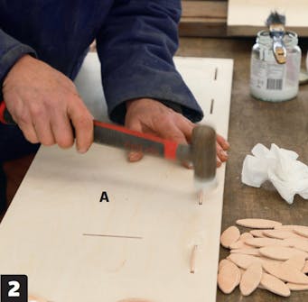 Det kan være smart kun at slå dyvler ned i de spor, der er lavet i pladernes flader. På den måde sikrer du, at du ikke får sat to dyvler over for hinanden. Sporene i pladekanterne fyldes herefter med lim, og så kan du slå pladerne sammen med dyvlerne som bindeled.