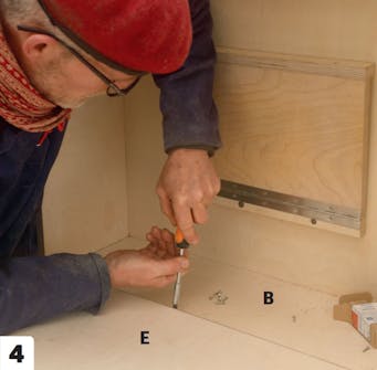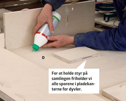 Kom lim i de udfræsninger, som fladdyvlerne skal passe ned i. Både der, hvor den lodrette vange (F) skal sidde, og i kanten af de øvrige plader.