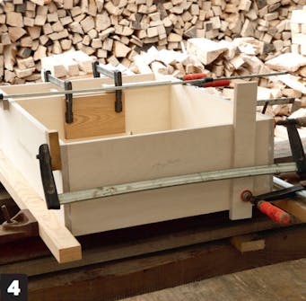 Når alle stykker er savet ud, prøvesamles møblet. Bagbeklædningen er trukket en pladetykkelse ind i møblet (for at skjule ophænget). Møblet samles i hjørnerne med malertape og låses fast med skruetvinger.