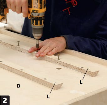 Nu kan vi endelig samle møblet. Det gør vi med de fladdyvler, vi har fræset spor til.
