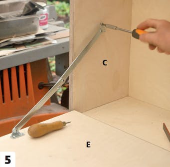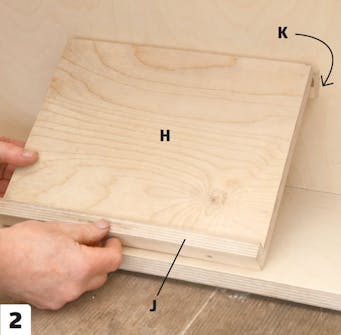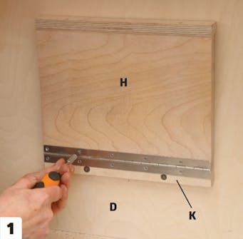 Skru listen (K) fast med 5,5 x 30 mm skruer, centreret på bagbeklædningen. Skru herefter et pianohængsel fast til listen og til pladen (H) med 3 x 16 mm skruer, så pladen kan vippes ned mod bundpladen.