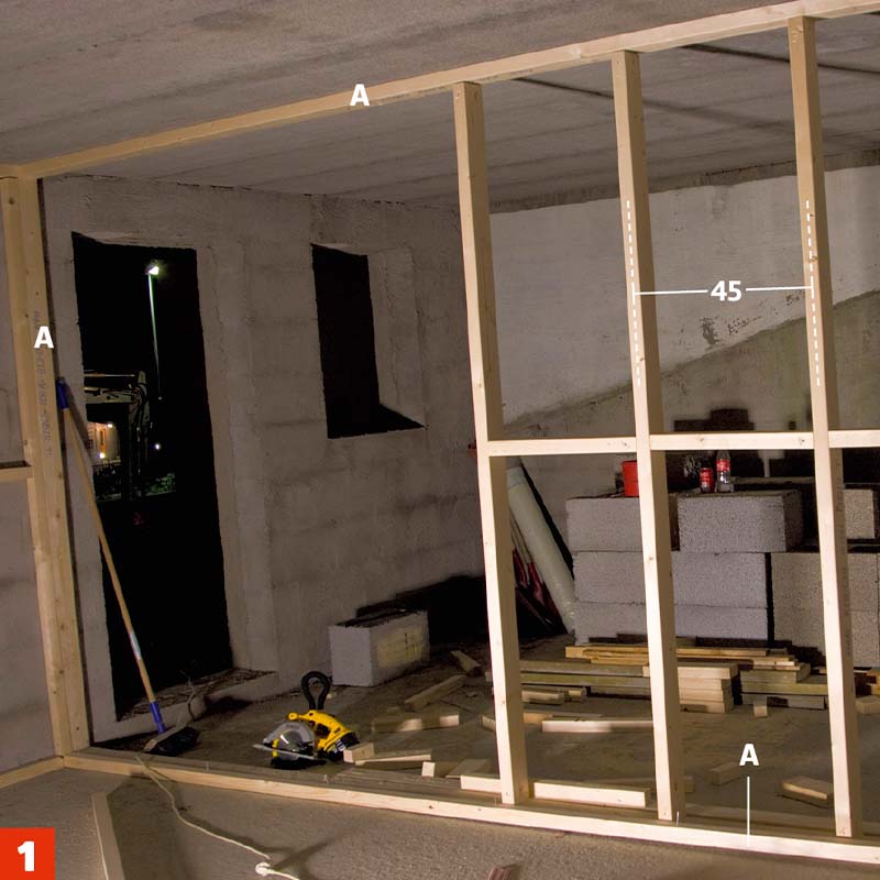 Skru bundrem, siderem og toprem (A) fast i henholdsvis gulv, vægge og loft. Er disse af beton, som i vores tilfælde, er du nødt til at bore for og bruge plugs. Herefter skrues de lodrette reglar (A) fast med spunskruer på 4,5 x 70 mm. For at sikre os, at vi altid har noget at skrue i, når vi skal montere gipspladerne, holder vi en afstand på 45 cm fra centrum på den ene reglar til centrum på den næste reglar.