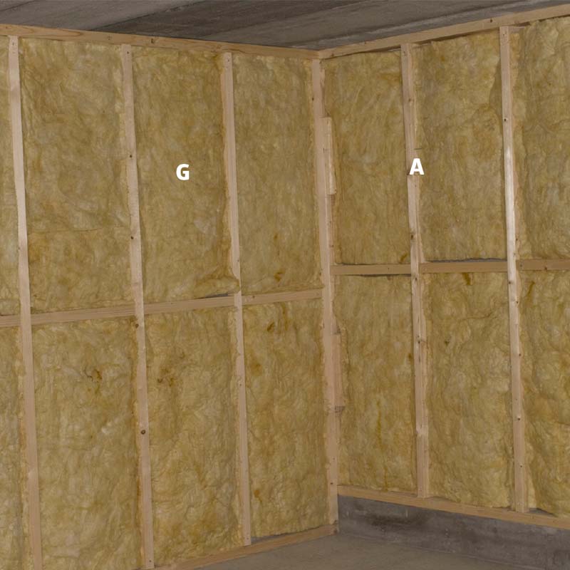 Fyld væggen med isolering (G), og montér herefter to lag gips (E) på væggen. Nu har du en helt almindelig skillevæg.