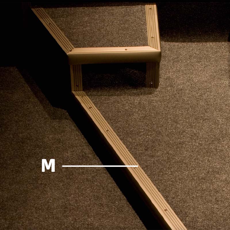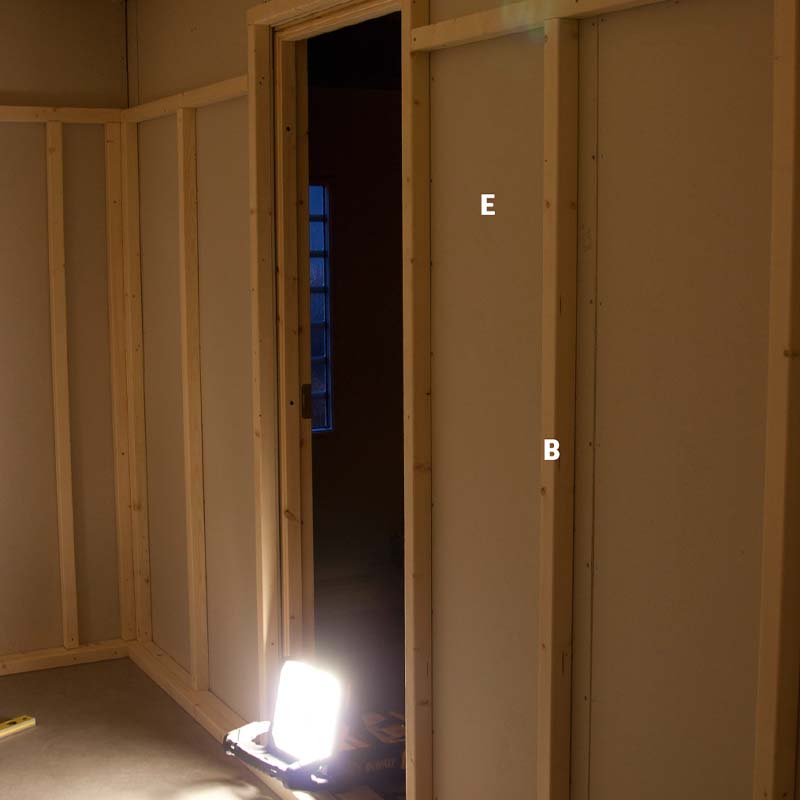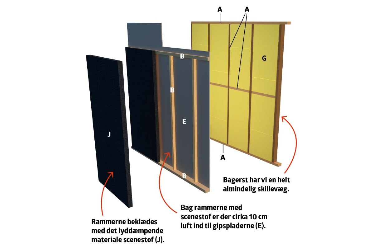 For at få den bedst mulige lyd monterer vi et lignende skellet på gipsvæggen (E) med lægter på 38 x 57 mm (B), så vi får luft mellem gipsvæggen og det lyddæmpende scenestof, som vi senere monterer. Læg mærke til, at vi også monterer en ekstra lægte som bundrem, så de rammer, vi senere monterer, har noget at stå på.