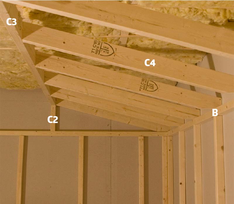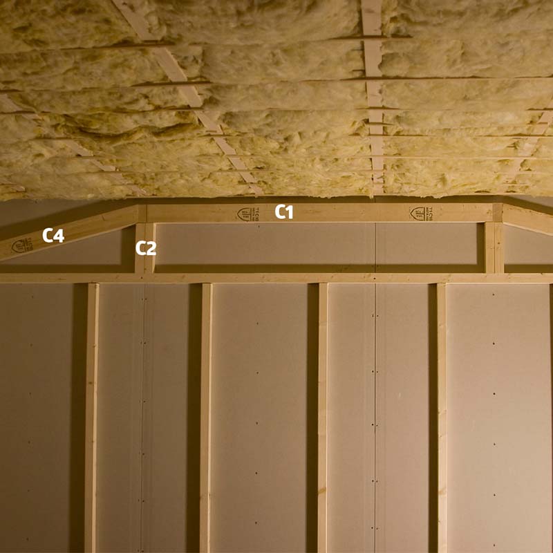 Læg et af de lange spær (C3) op på de lodrette støtter (C2), og skru det fast med spunskruer på 4,5 x 70 mm. Herefter skæres sidestykkerne (C4) i smig på en kap-/geringssav, så de får præcis de samme vinkler som stykkerne på skabelonen. Slut af med at skrue sidestykkerne fast på det lange spær (C3) og væggens skellet (B).