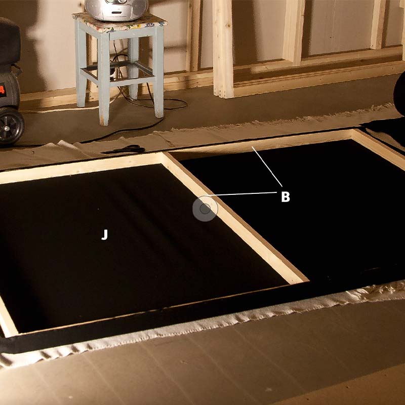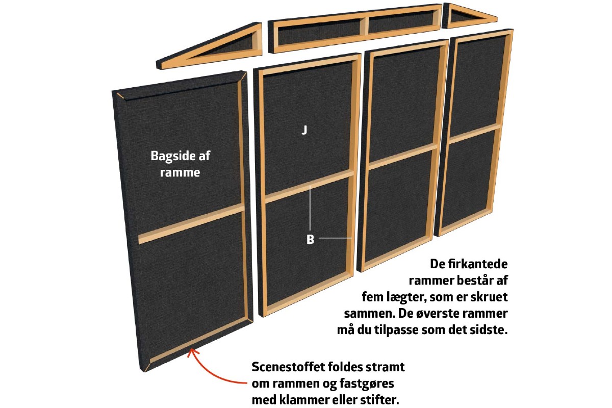 Byg en ramme af lægter på 38 x 57 mm (B) med en bredde på 90 cm, og skru den sammen med spunskruer på 4,5 x 70 mm. Læg rammen på et stort stykke scenestof (J), og klip herefter stoffet til, så det rager 10-15 cm ud på alle sider. Træk stoffet stramt ud over rammen, og gør det fast med stifter eller klammer.