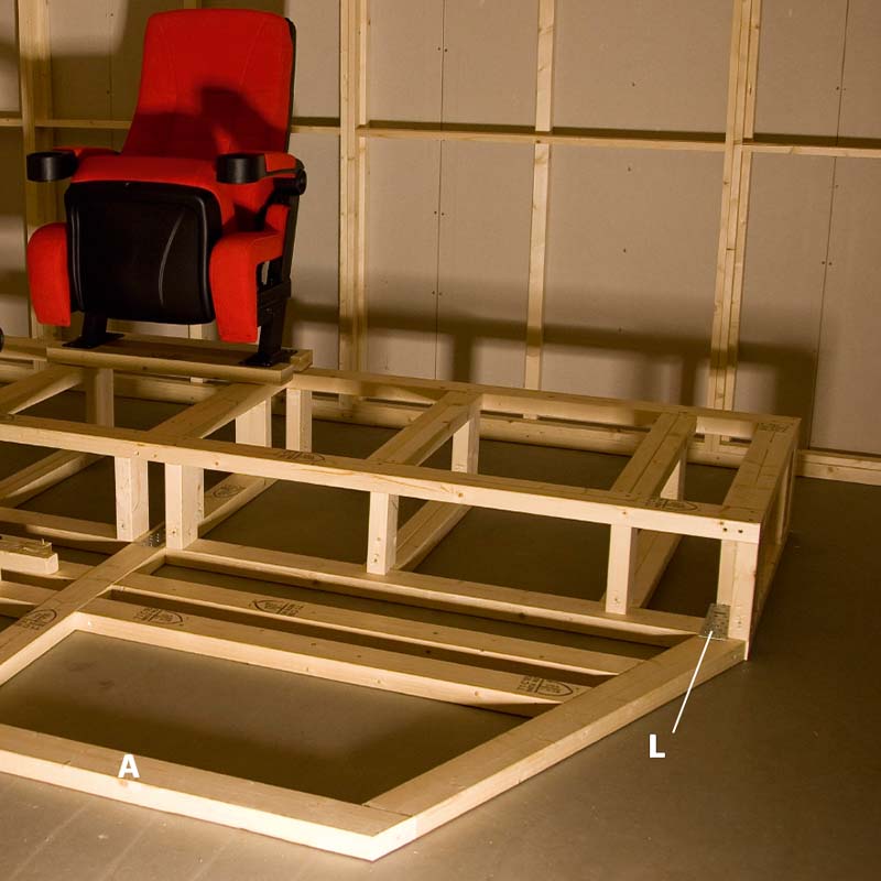 Vi bygger to simple kasser af reglar på 45 x 95 mm (A), så det passer med, at vi kan montere fire biografstole på den bagerste række. Herefter bygger vi et ganske lavt plateau til de forreste tre stole af de samme reglar. Brug gerne vinkelbeslag (L).