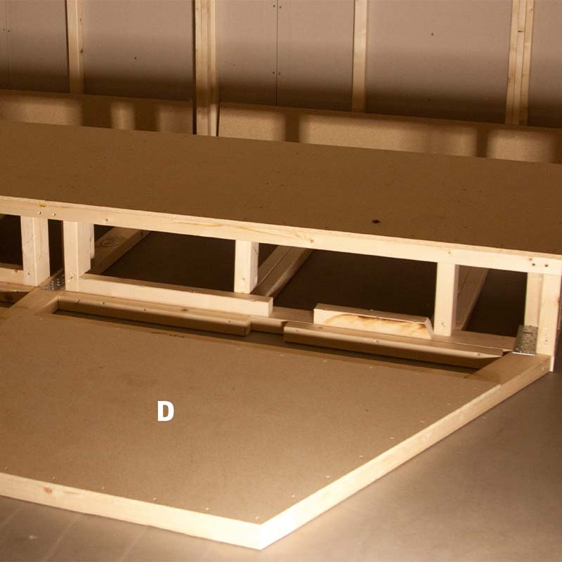 Luk hele reposet med spånplade (D). Der skal skæres en del, så her er en bordrundsav genial, men en håndrundsav kan bestemt også gøre det. Da vi skal lægge gulvtæppe på, er det vigtigt, at hele reposet er plant, og at der ikke er noget, der rager op. Når først pladerne kommer på, bliver reposet bundsolidt.