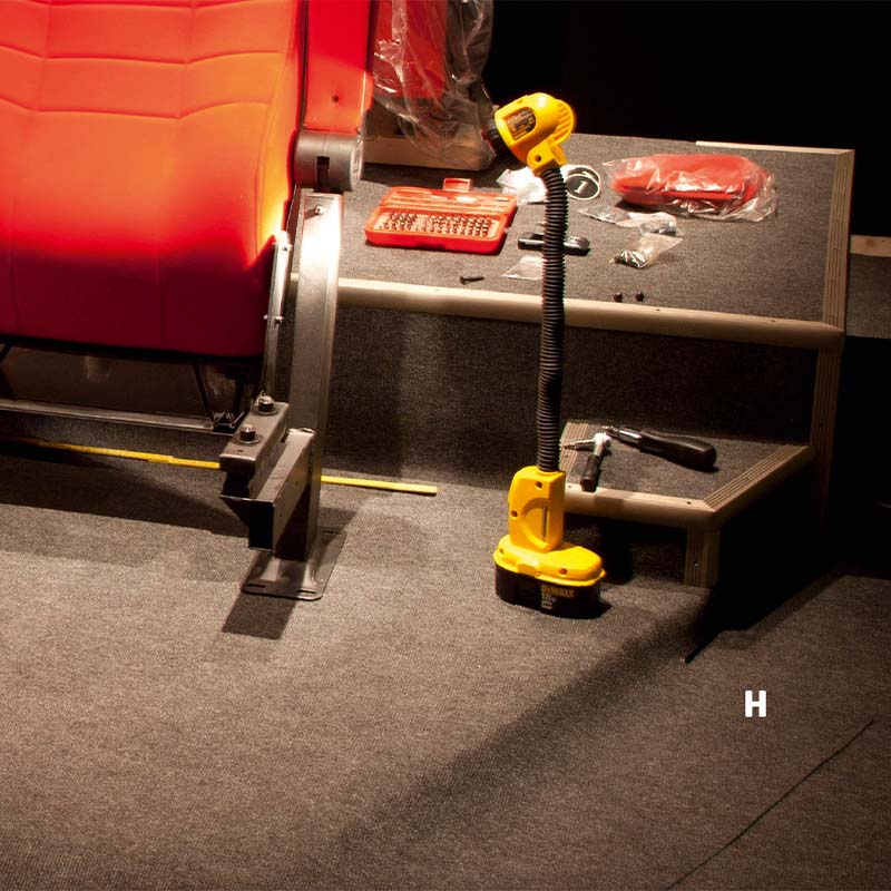 Fordel lidt gulvlim på fladerne, og tryk gulvtæppet (H) godt fast. Skær tæppet til med en hobbykniv, og sørg for, at der er rigeligt med længde nede ved gulvet, hvor det også skal fastgøres. Nu er der bare tilbage at skrue stolene fast, få styr på teknikken og hente popcornene.