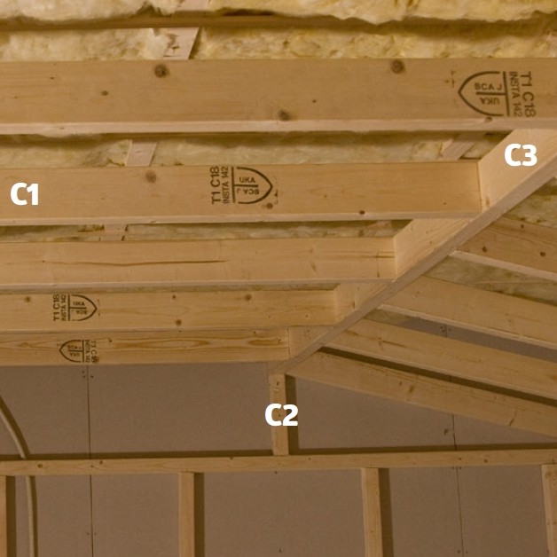 Læg en skabelon af spærkonstruktionen op i den ene ende af rummet for at se, om det hele passer, og tegn den op med en blyant på gipsvæggen. Konstruktionen består af en overligger (C1), to støtter (C2), to lange spær (C3), to skrånende sidestykker (C4) og fire lodrette støtter (x), som hviler på væggens skellet. Vi bruger her spærtræ på 45 x 150 mm.