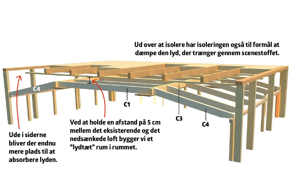 Det mindsker lydrefleksionen og gør rummet mere intimt. Vi isolerer den øverste del af loftet og monterer til sidst rammer beklædt med scenestof.