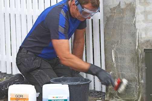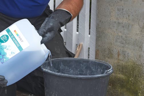 3. Algefjerneren påføres. På mindre områder gøres det med en stor pensel. På store områder går det hurtigere med en havesprøjte. Skrub godt, og lad algefjerneren virke 2-3 dage. Husk handsker og beskyttelsesbriller, når du arbejder.