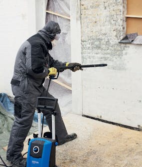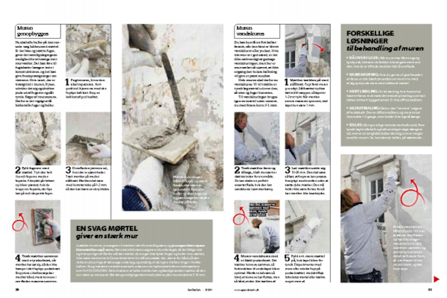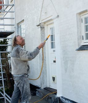 Mureren begynder med at rense murværket helt i bund - helt ind til rent murværk, hvor der ingen rester af maling er tilbage, og hvor alt murværk er godt fæstet. Arbejdet kan du klare med håndredskaber som murhammer, skrabejern og stålbørste, men det mest effektive på større opgaver er en højtryksrenser. Har du ikke sådan en, lejer eller køber du den til formålet. Det vil du ikke fortryde, den tjener sig selv hjem på ingen tid.