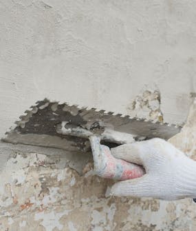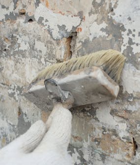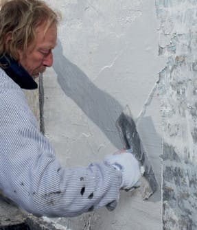 Fjern fastsiddende, tykke flager af kalk, hvis muren skal tyndpudses, eller du ønsker en meget jævn mur. Her er murhammeren effektiv. Skal en ellers pæn, kalket mur genbehandles, fjernes kun løs kalk.