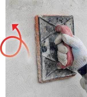 Muren vandskures med et blødt pudsebræt. Det trækker kornene sammen, så forbindelsen til underlaget bliver optimal. Mørtlen skal være så blød, at kornene kan flyttes, men så hård, at den ikke trækkes af.