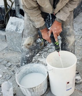 Hvidtekalken blandes med piskeris på boremaskine. Her røres en 25 kg’s spand med kulekalk op med vand. Du bliver rådet til at røre op med kalkvand, men det er en dyr og unødvendig udgift.