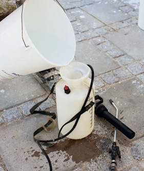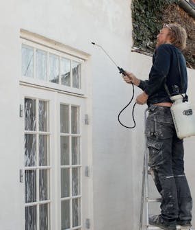 Bland kalkvand i en havesprøjte. Den er helt ideel, når muren skal sprøjtes over med kalkvand. Her bruges færdigt kalkvand. Det koster lidt ekstra, men er nemt, og så får du den helt rette blanding.