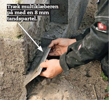 Træk et tyndt lag hurtigttørrende multiklæber på den gamle sokkel med en bredtandet spartel (fx 8 mm). Få fat i nogle gamle spande eller meget billige plasticspande, som du kan blande klæber i - den er ikke til at rense af, når den er tør.