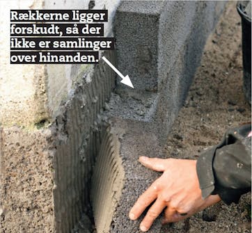 Skub sokkelstenene ind på plads i en glidende bevægelse, når du har smurt et tyndt lag multiklæber på. Brug et vaterpas til at kontrollere, at stenen er i vater, så du har let ved at lægge andet skifte op til stregen. Andet skifte mures forskudt.