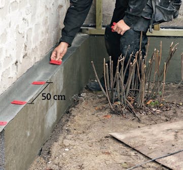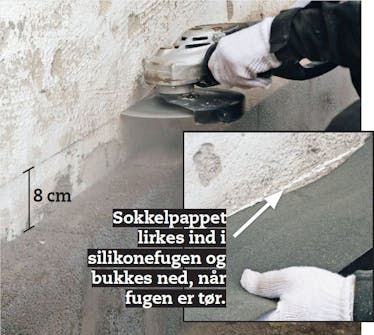Tag en stor vinkelsliber, og skær en min. 2,5 cm dyb fuge i væggen 8 cm over soklen. Efterfølgende fylder du fugen med almindelig bygningssilikone og skubber 30 cm sokkelpap ind i fugen. Buk pappet ned, så det flugter med soklen.