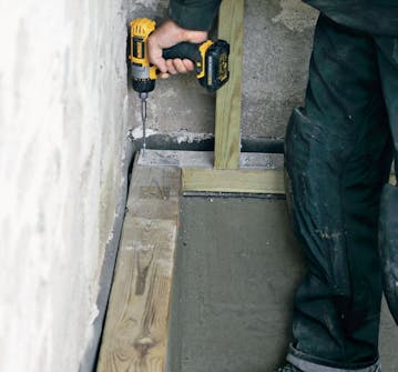 Forbor i skiferpladen med et 6 mm murbor, og undersænk derefter, så skruehovedet ikke sidder i vejen senere. Læg skiferpladen i vindueshullet, og skru den så forsigtigt fast i underlagslisten med en 6 x 50 mm stålskrue.