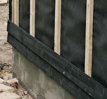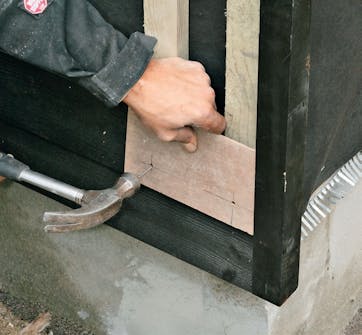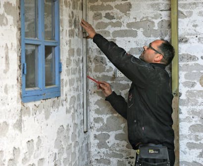 Skru nu afstandslister på for at sikre ventilation bag beklædningen. Brug 25 x 50 mm klemlister. Her skal du også bruge en vandret snor, så du får listerne til at passe i bunden.