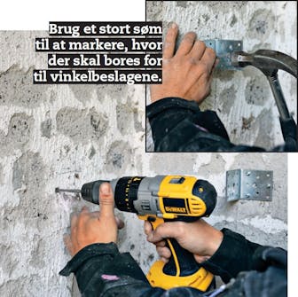 Skru tre vinkelbeslag ind i væggen pr. reglar og ét i bundremmen. I mur og letbeton skal du bore for og bruge nylondyvler, så skruerne har noget at bide fast i. I trævægge er det ikke nødvendigt.