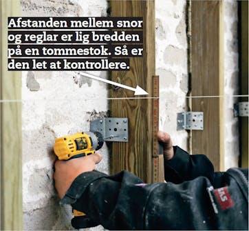 For at holde beklædningen vandret hele vejen op skal du sætte ens horisontale mål af i begge ender af facaden og spænde snore ud. Husk, at træet skal have plads til at arbejde, så du skal lave et par mm luft for hvert flerde bræt.