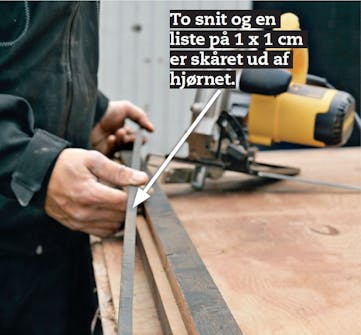 Tilpas de udvendige hjørnelister, inden du monterer klinkbrædderne. Brug en almindelig rundsav med land, og skær et 1 x 1 cm snit i et af hjørnerne. Falsdybden afgør listens fremspring i forhold til klinkbeklædningen.