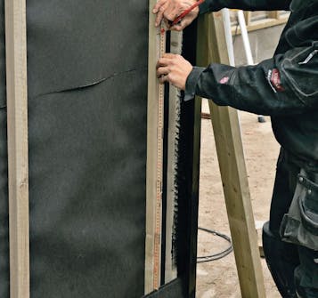 På pappen lægger du nu afstandsklodser af plastic for hver 50 cm. VIGTIGT! Klodsen må ikke være mere end maks. 4 mm tyk, så du kan være sikker på, at mus og andre smådyr ikke kan krybe ind i den nye, lune facade.