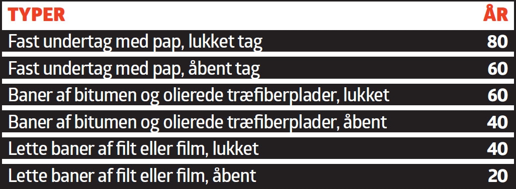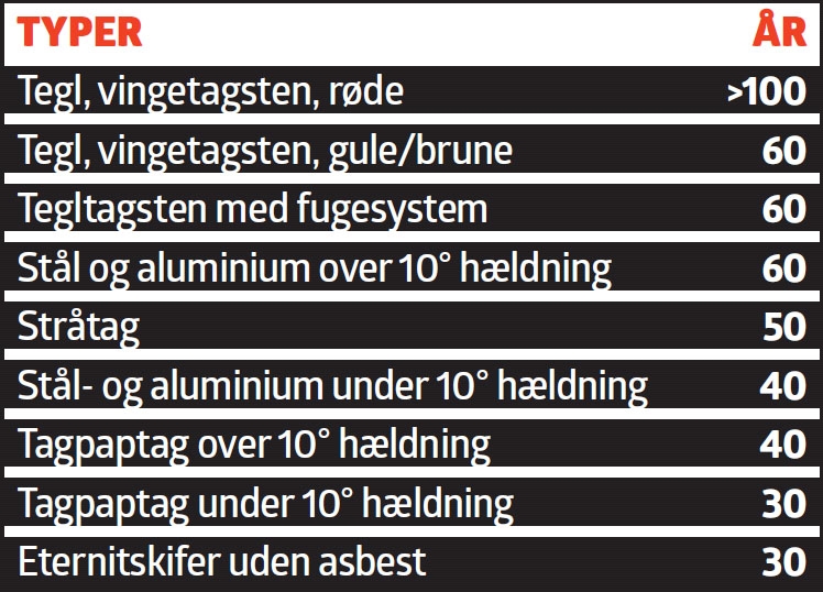 Når forsikringsselskaber sætter tal på, hvor længe en type tagbeklædning kan holde ved en given taghældning, er det kun et udgangspunkt for en individuel vurdering. Til hver en tid må man justere for, hvor længe materialet nu har holdt, hvordan det er holdt ved lige, hvordan konstruktionen er, og hvor udsat det ligger i forhold til vind, vejr og brug.