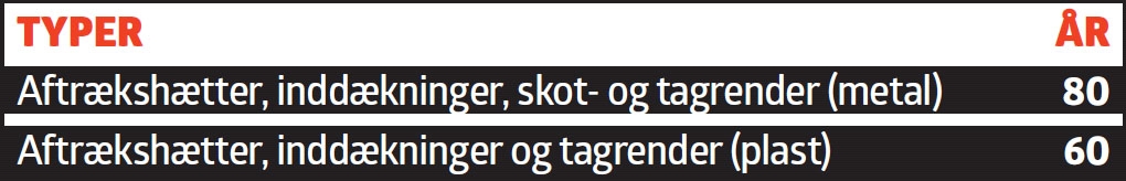 Aftrækshætter, tagrender, skotrender og inddækninger samles i nogle officielle levetidstabeller som et punkt, og den skønnede levetid er meget lang for dem alle. Et eksempel på at du også må foretage din egen vurdering og holde øje med delene, for en billig plasttagrende har langt større risiko for at få skader i frost, end en solid rende af zink har. Det er vigtigt at holde øje med gruppen her. Delene er billige at skifte ud i forhold til de skader, de kan give, hvis de bliver utætte.