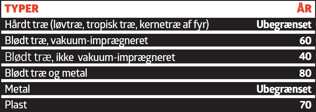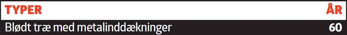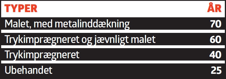 Vindskeder og sternbrædder har ofte været tænkt som offertræ, altså træværk som sidder meget udsat og må skiftes ofte, men som til gengæld beskytter de dybereliggende dele af konstruktionen. Tabellen rummer fire traditionelle udgaver, som skal passes og males for at holde levetiderne her, men i dag bruges også materialer som kompositbrædder og eternit, der også holder i masser af år, uden at du må op på stigen og male dem.