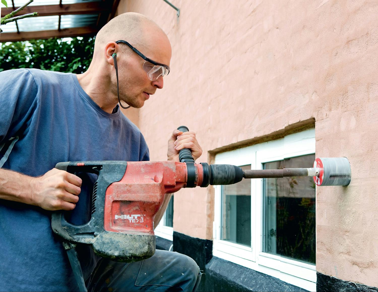 Med en kraftig borehammer og et solidt kopbor kan du bore dig igennem en mur eller en muret sokkel. Både maskine og bor kan lejes for et par hundrede kroner.