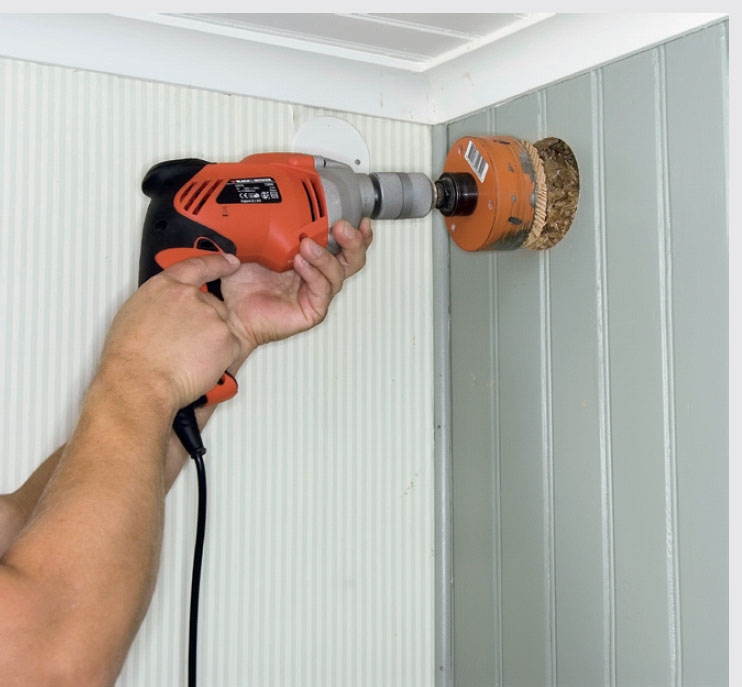 Det eneste, det kræver, er en boremaskine med et spadebor. Til denne model ventiler skal vi bruge et 16 mm bor.