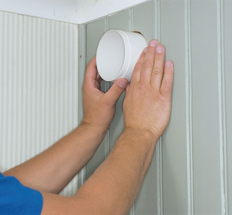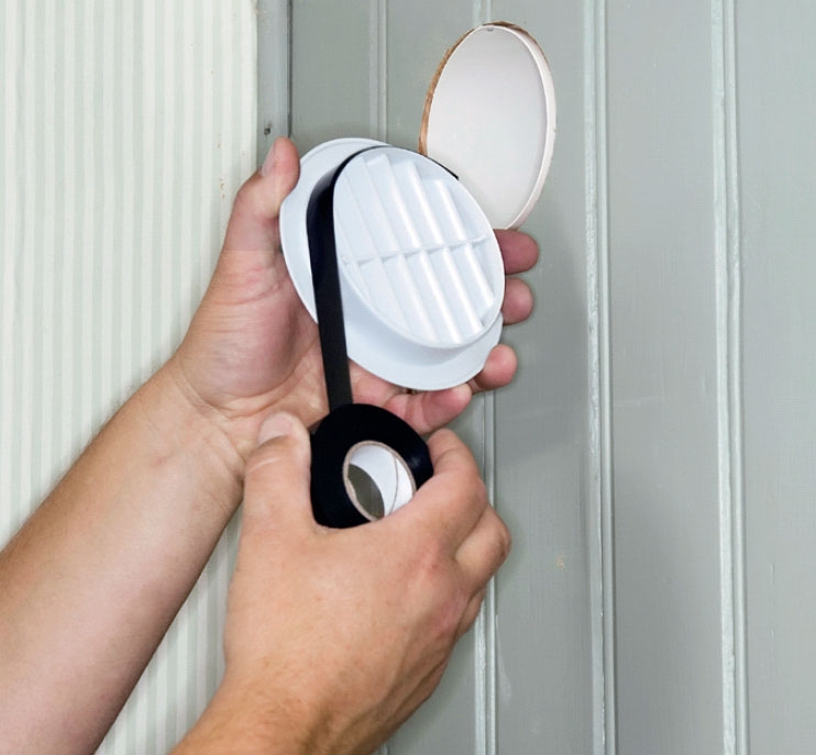 Sæt lidt tape rundt om ventilen (risten). Det sikrer, at den sidder ordentligt fast. Sæt så ventilerne i røret på begge sider af væggen.