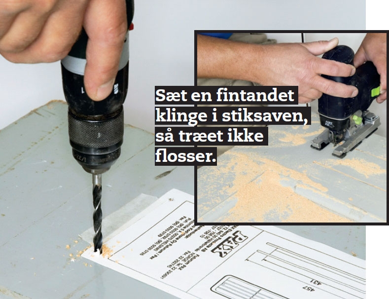 Bor for med et tyndt bor, fx 5 mm. Sørg for at bore helt lige igennem rammen. Er du usikker, så mærk hullerne op med skabelonen indefra, og bor halvt ind fra begge sider.