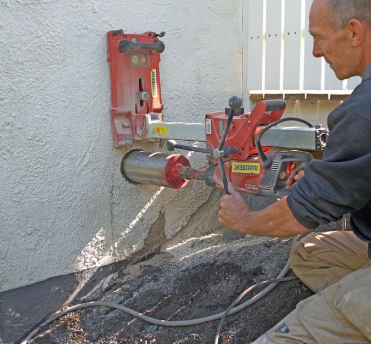 Hullet til udluftningsventilen kræver samme kraftige værktøj som hullet til indblæsningen. Når placeringen er fundet, kan du med fordel bore et lille hul indefra, så du ved, hvor du skal “angribe” ydermuren med kerneboremaskinen.
