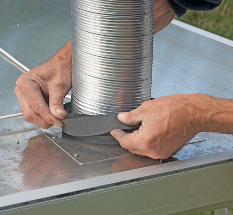 Herefter kan gennemføringsrør og tætningsring sættes på ventilatorstudsen. Og vi er klar til at forberede selve ophængningen.