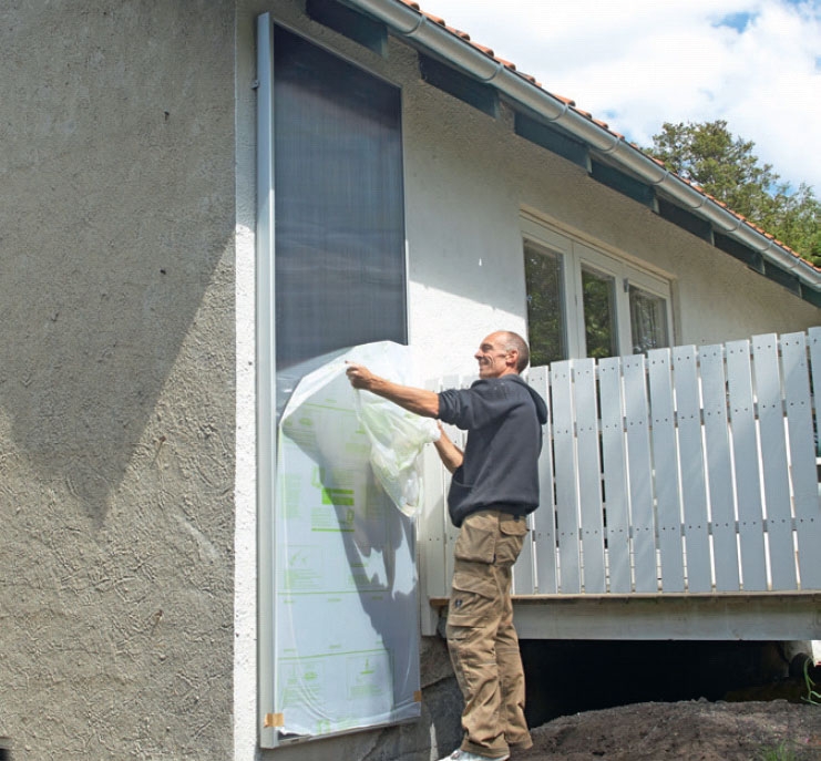 Du kan nu fjerne solfangerens beskyttelsesfilm, og så er det tid til at gå indendørs, hvor sidste del af solfangerens montering foregår.