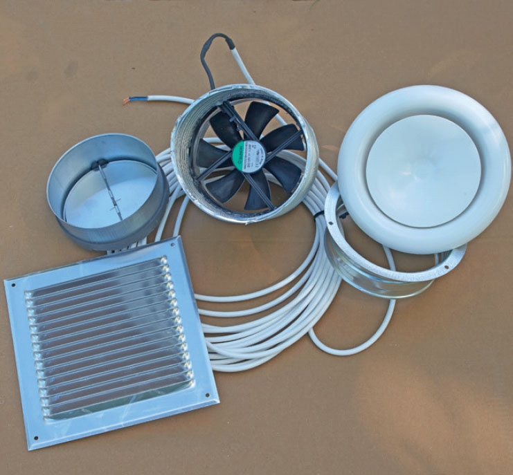 Udluftningsventilen kommer her som et samlesæt. Den drives som nævnt af solcellerne i solpanelet og består af et flexrør med indbygget ventilator, et kontraspjæld, en krave, en drejeventil og en ventilationsrist.