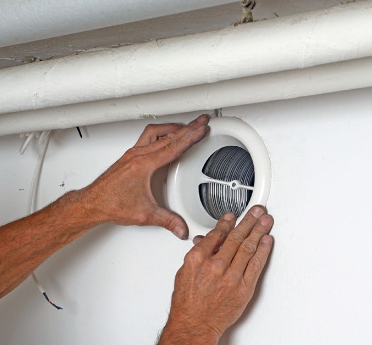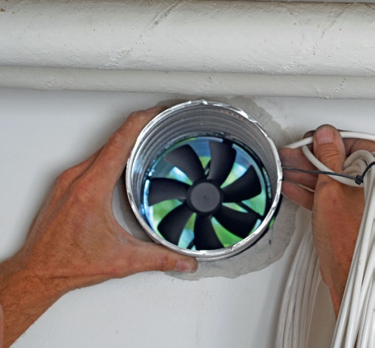 Når hullet i muren er boret, stikkes røret med ventilatoren ind på plads. Ledningen trækkes herefter hen til det sted, hvor styringen skal placeres.