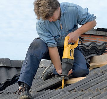 Sav nu et hul igennem hele tagkonstruktionen. En stiksav eller en bajonetsav er velegnet. Husk, at røret er 100 mm i diameter og skal isoleres, så et hul på Ø 200 mm er passende.