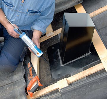 Nederste del af taghætten skal sættes fast. Her er der undertag med tagpap. En lægte saves over, hættens flade krave skubbes ind under pappet. Hætten fæstnes med facadeskruer, pappet limes fast, og lægten sømmes på igen.