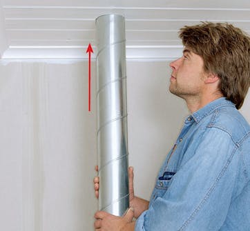Skub spirorøret opad, indtil det sidder helt plant med selve loftsbeklædningen. Gør det midlertidigt fast med et lille søm eller en kile.